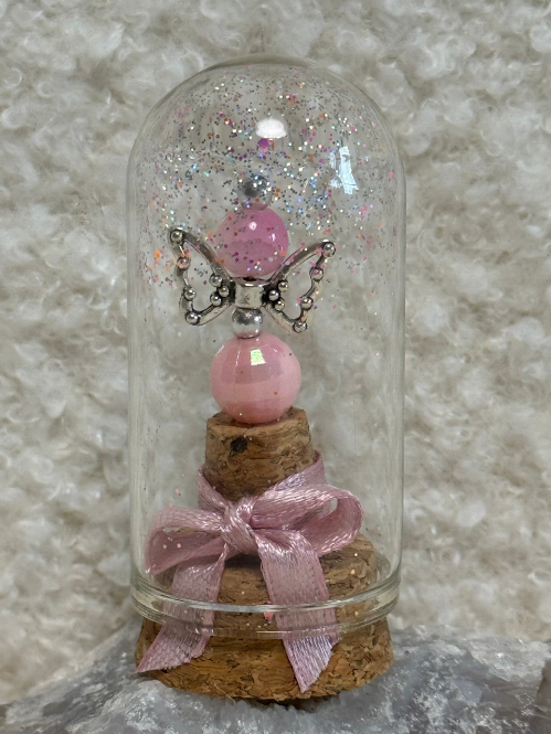 - Materiaal: glas, kurk, kralen, satijnlint, glitter