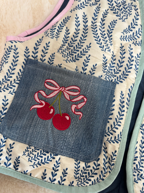 Zacht gewatteerd en met borduursels, denim zakken. Perfect voor iedere gelegenheid of gewoon voor de leuk op je jeans of jurk